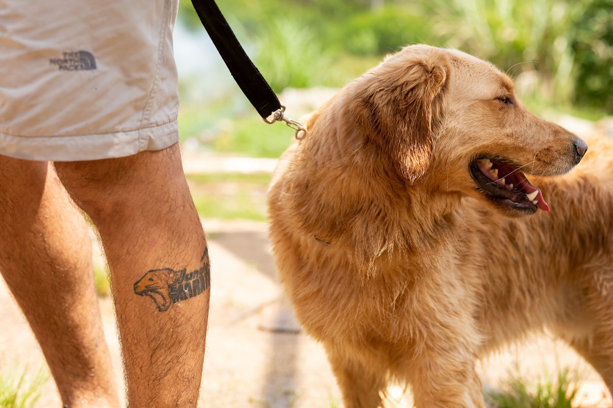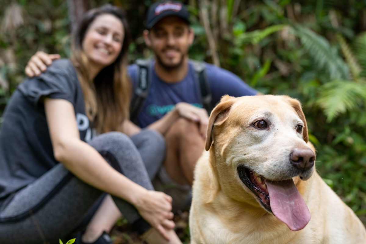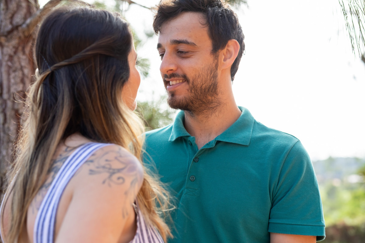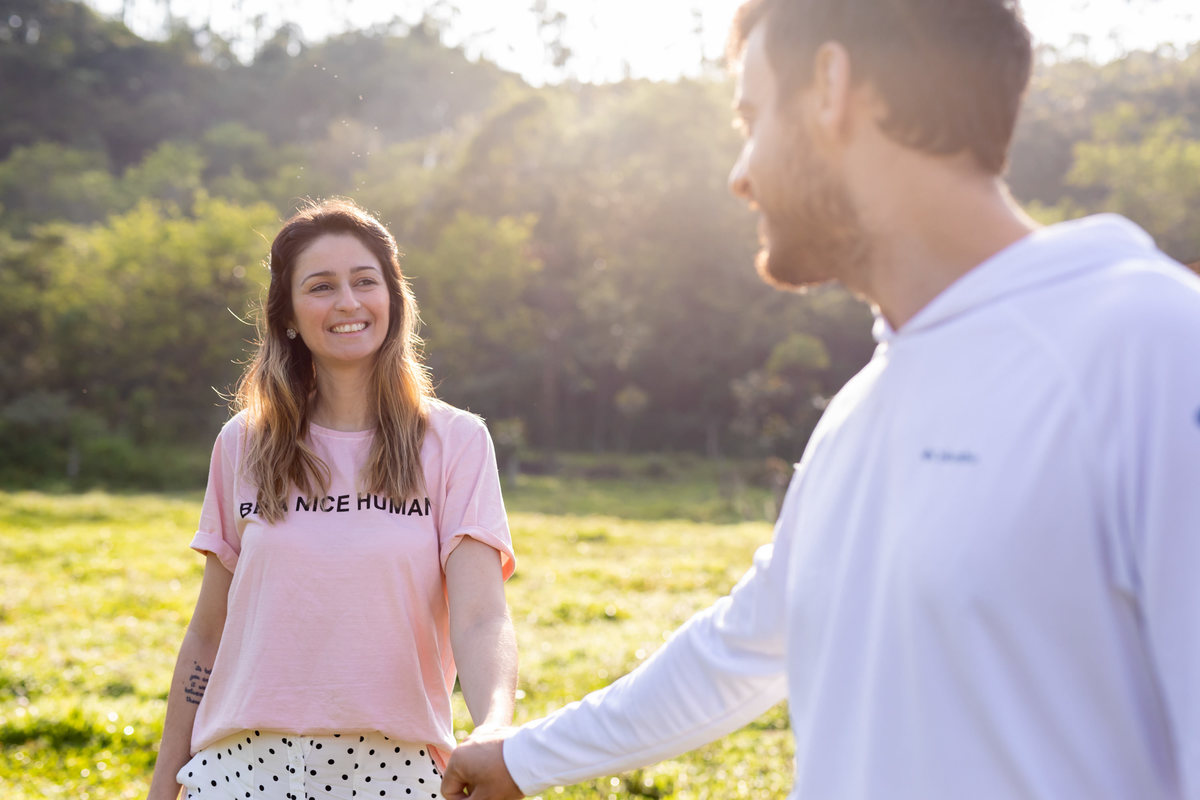 Cabelo solto, maquiagem leve, bermuda, camiseta esportiva, pés descalços, mato, lama, Bud e Duff, assim foi a sessão de fotos deste casal descomplicado e feliz!