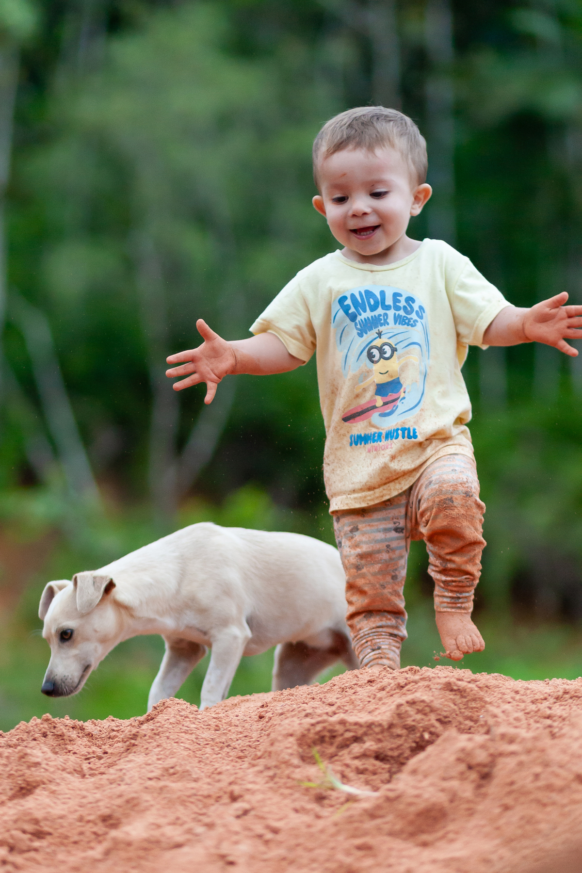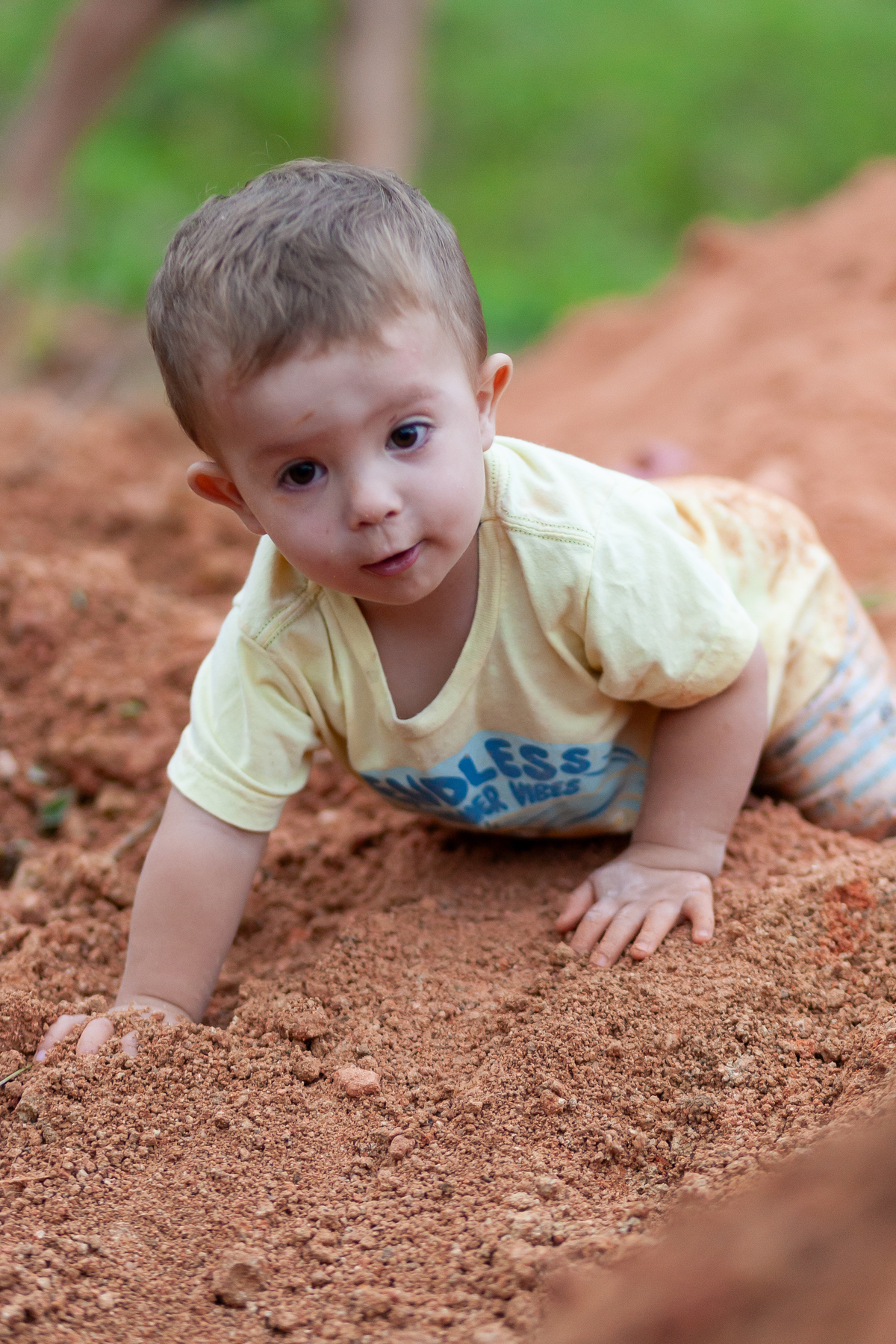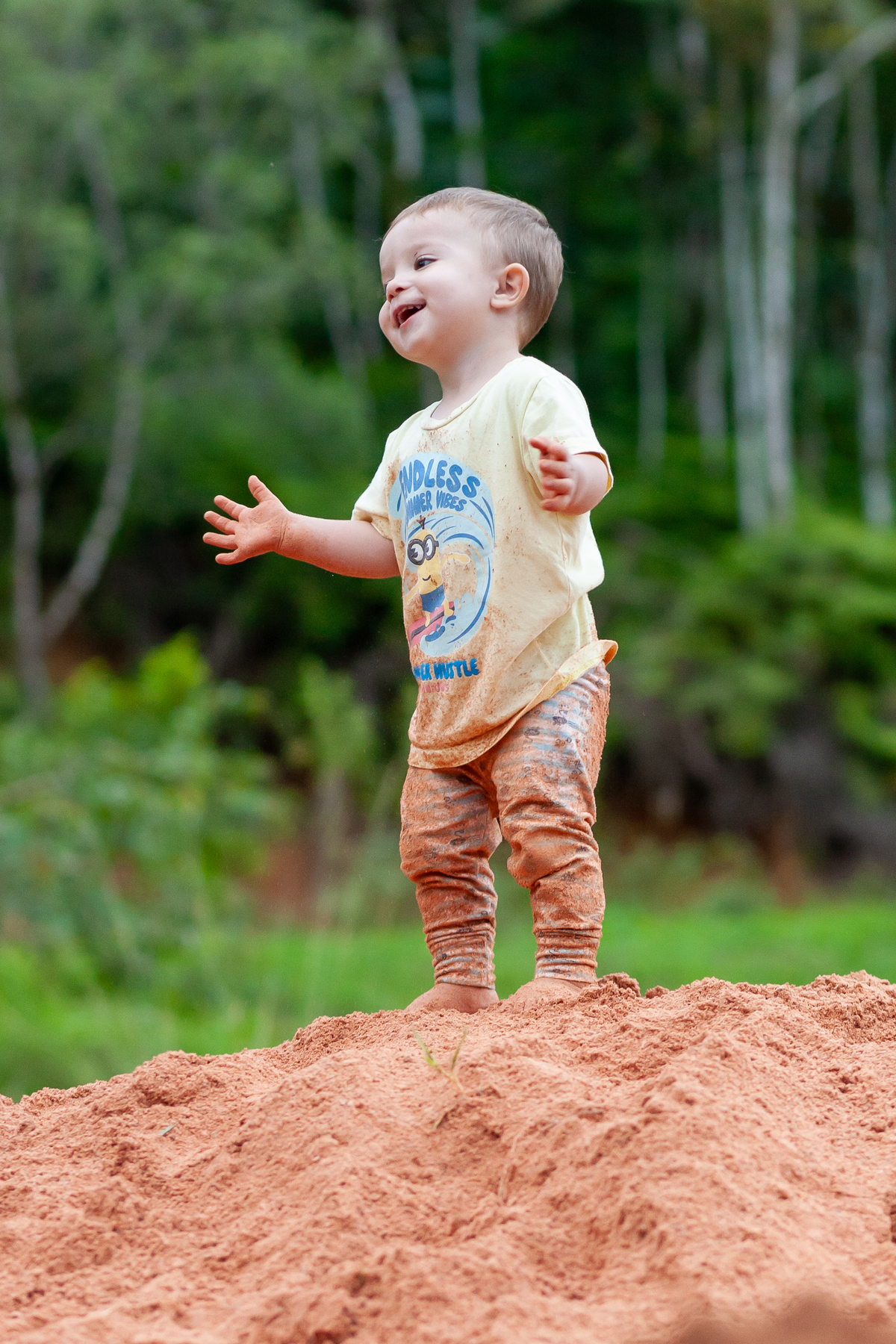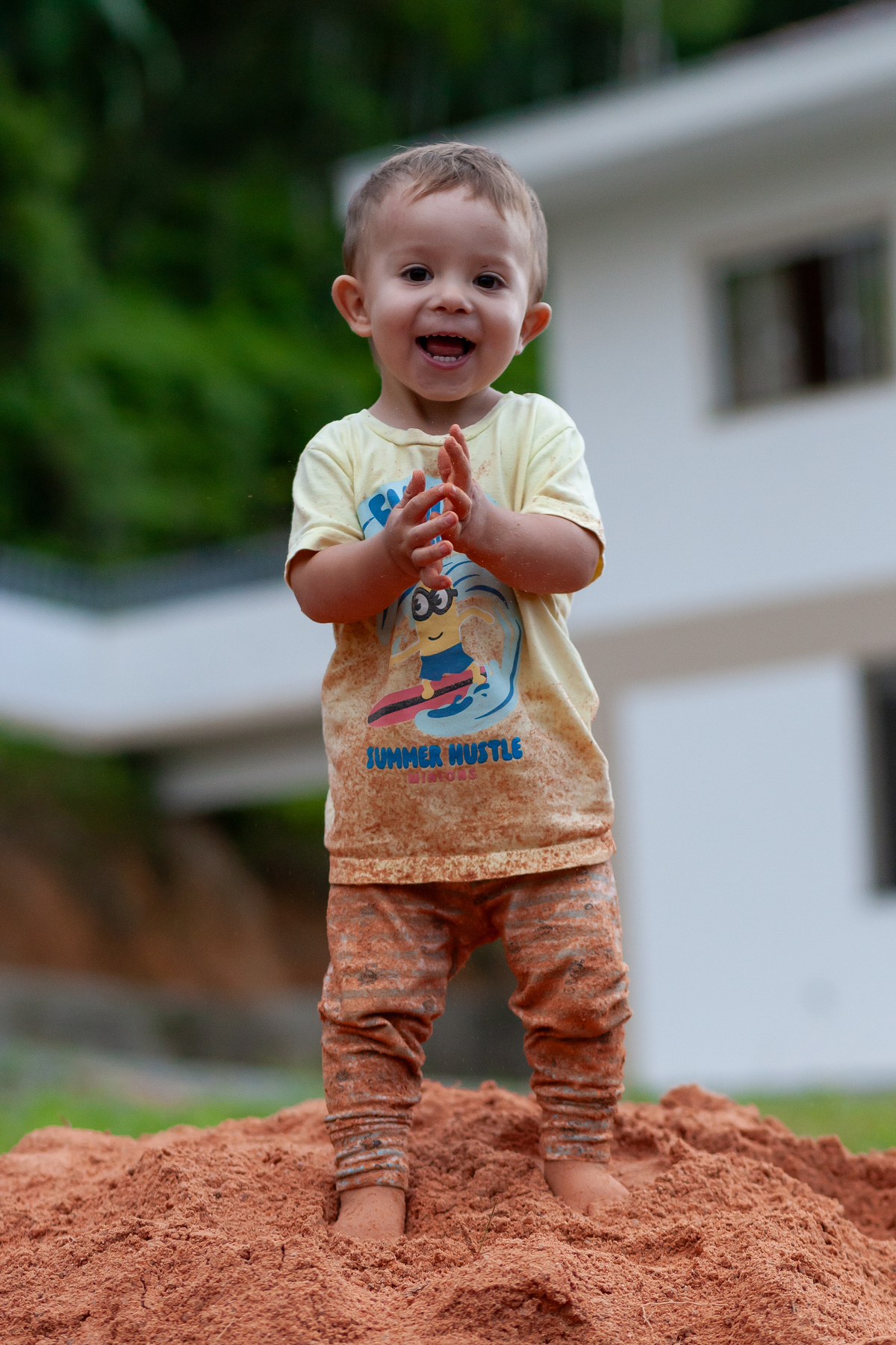 Não raro ele está sujo de barro, compartilhando comida com os cachorros, correndo no galinheiro, comendo acerola ou araçá direto do pé, inventando inúmeros brinquedos com caixas de papelão e pedaços de madeira. Roupa suja a ponto de não conseguir lavar? Ah, para isso nem ligo mais!