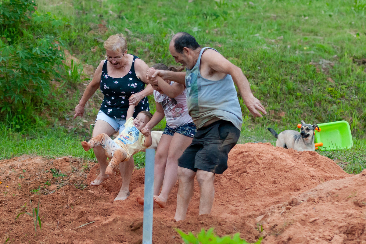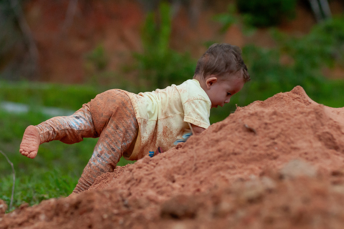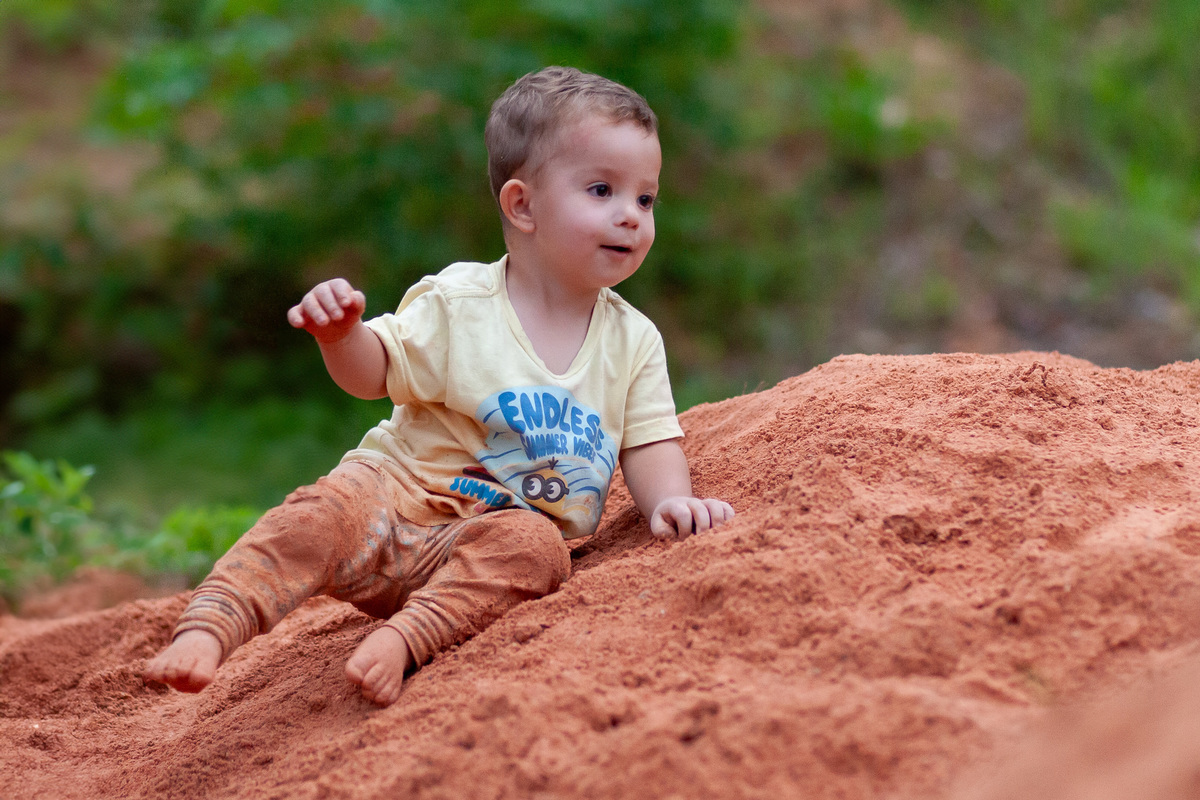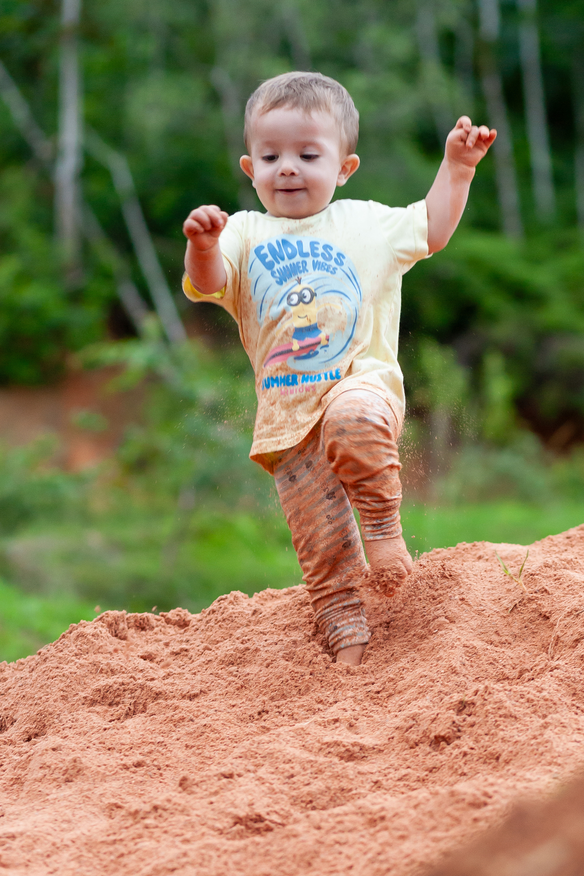 Não raro ele está sujo de barro, compartilhando comida com os cachorros, correndo no galinheiro, comendo acerola ou araçá direto do pé, inventando inúmeros brinquedos com caixas de papelão e pedaços de madeira. Roupa suja a ponto de não conseguir lavar? Ah, para isso nem ligo mais!